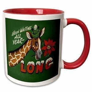 Sandy Mertens Vintage Christmas Designs – Cartoon Giraffe Wearing Stocking Hat with Holly Christmas Greeting – 11oz Two-Tone Red Mug (mug_172729_5)